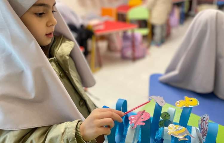 دختر نازم باید برای هر کلمه نقاشی متناسب با آن را بکشد و رنگ آمیزی کند ، همچنین کلمه را بخواند و تکرار کند.