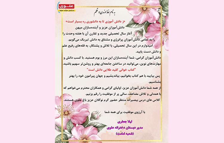 دانشآموزان عزیز و آیندهسازان میهن «ز دانش آموزی تا به دانشوری ره بسیار است» آغاز سال تحصیلی جدید را به تمامی دانشآموزان پرانرژی و مشتاق به دانش تبریک میگویم. امیدوارم در این سال تحصیلی، با تلاش و پشتکار، به قلههای رفیع علم و دانش دست یابید. دانشآموزان گرامی، شما آیندهسازان این مرز و بوم هستید. با کسب دانش و مهارتهای نوین، میتوانید در ساختن جامعهای بهتر و روشنتر سهیم باشید. "کتاب خوانی کلید طلایی دانش است" پس بیایید با هم کتاب بخوانیم، بیاندیشیم و جهان پیرامون خود را بهتر بشناسیم. از همه شما دانشآموزان عزیز، اولیای گرامی و همکاران محترم میخواهم که با همدلی و تلاش مضاعف، سالی پر از موفقیت را رقم بزنیم. کلاس های درس بیصبرانه منتظر حضور گرم نوگلان عزیز باغ علوی هستند. با آرزوی موفقیت برای همه شما لیلا جعفری مدیریت دبستان دخترانه علوی (شعبه امامت)