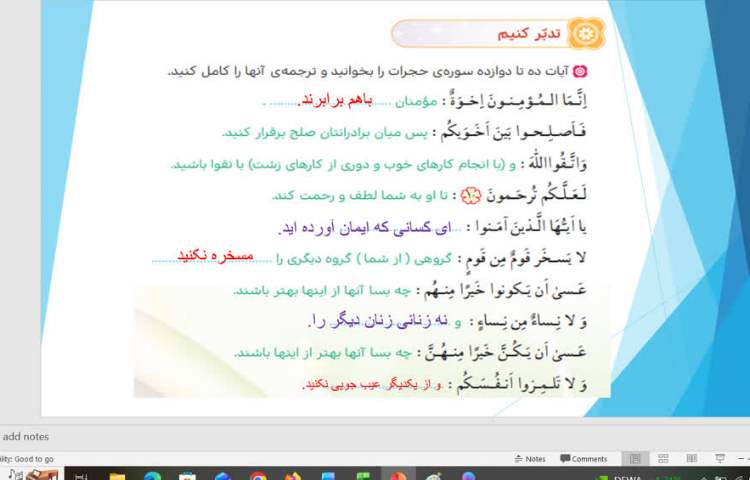 در این جلسه روش های ایجاد و حذف اسلاید، مفهوم قالب بندی اسلاید و نحوه انتخاب قالب بندی برای اسلاید آموزش داده شد، همچنین دخترهای عزیزم فعالیت صفحه 26 کتاب را در کلاس به صورت گروهی انجام دادند.