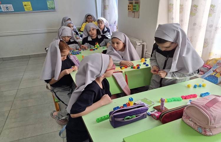 ریاضی و بازی: اشکال مختلف با رنگهای متفاوت داخل یک جعبه گذاشتیم و دانشآموزان بنا بر ذهنیت خود شکلهایی که فکر میکردند؛ شبیه به هم هستند را جدا کردند.