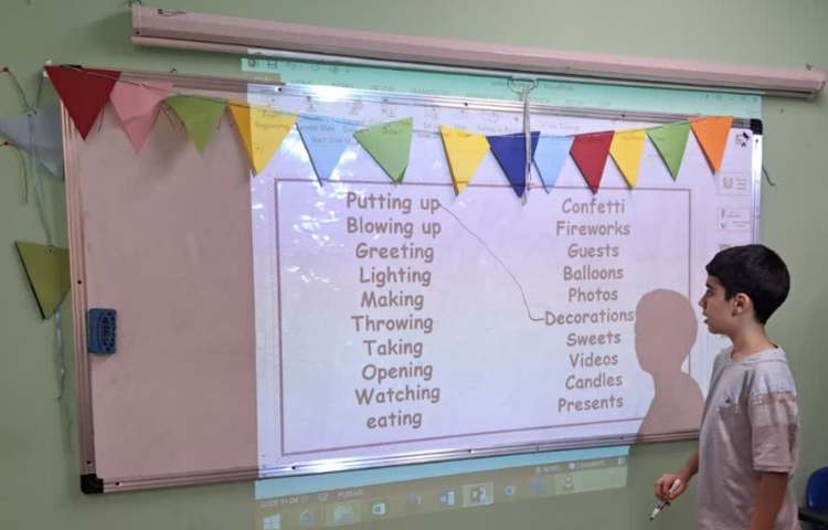 سوره کوثر به زبان انگلیسی خوانده شد. صفحه 28، مباحث سایه و منابع نور مرور و همچنین فعالیت های گروهی مربوط به مباحث تدریس شده، در کلاس انجام شد.