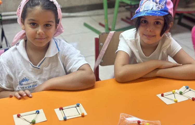 یکی از دانش آموزان کلمه را با نی به داخل لیوان می اندازد و هم گروهی اش آن را پای تخته یادداشت میکند .