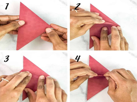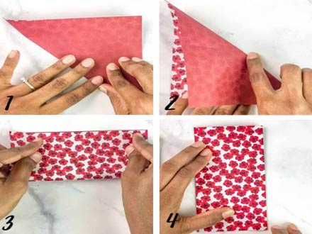 مرحله اول این است که کاغذ رنگی را با کنار هم قرار دادن گوشه‌های مخالف تا کنید. در حالی که قسمت گلدار به سمت بالا باشد، کاغذ را به صورت مورب تا کنید و لبه پایین سمت چپ را به گوشه بالا سمت راست ببرید. مطمئن شوید که گوشه‌ها در یک راستا قرار دارند. سپس کاغذ را باز کنید. کاغذ را دوباره به صورت مورب تا کنید، این بار لبه بالا سمت راست را به گوشه پایین سمت چپ نزدیک کنید. دوباره کاغذ را باز کنید. یکبار هم کاغذ را به صورت افقی تا کنید.