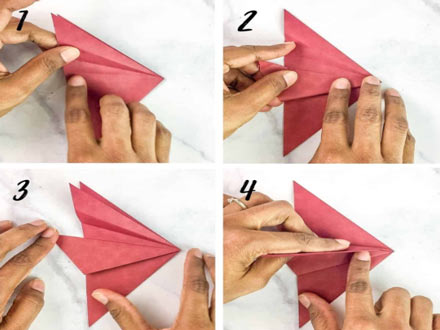برای مرحله سوم ابتدا مثلث را مطابق تصویر در محل کار خود قرار دهید. سپس قسمت بالایی مثلث را همانطور که نشان داده شده است بالا بیاورید. آن را تا وسط مثلث تا کنید. و سپس قسمت تا شده را از وسط تا کنید. چین‌ها را محکم فشار دهید. پس از تا کردن، کاغذ باید به این شکل باشد.